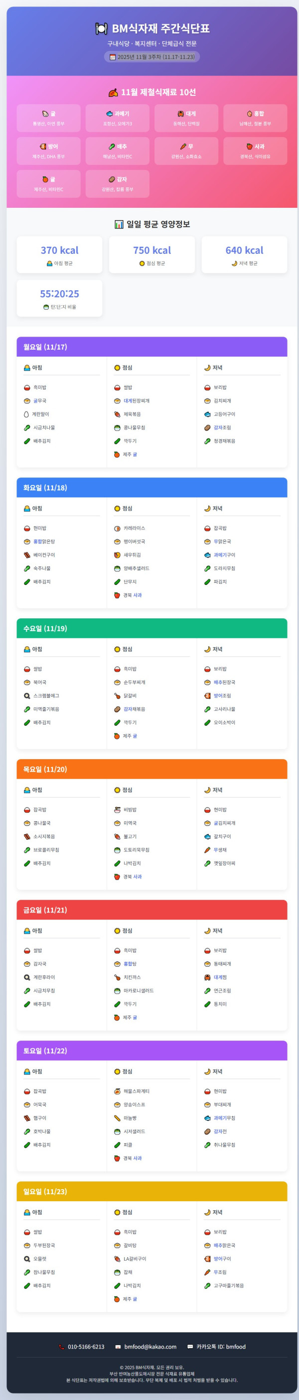 2025년 11월 3주차 (11.17-11.23) 페이지 정보 작성자 비엠식자재 댓글 0건 조회 22회 작성일 25-11-24 23:37 본문 2025년 11월 3주차 (11.17-11.23) 목록 다음글BM주간식단표(2025년 11월 10일~16일) 25.11.07 댓글목록 댓글목록 등록된 댓글이 없습니다.