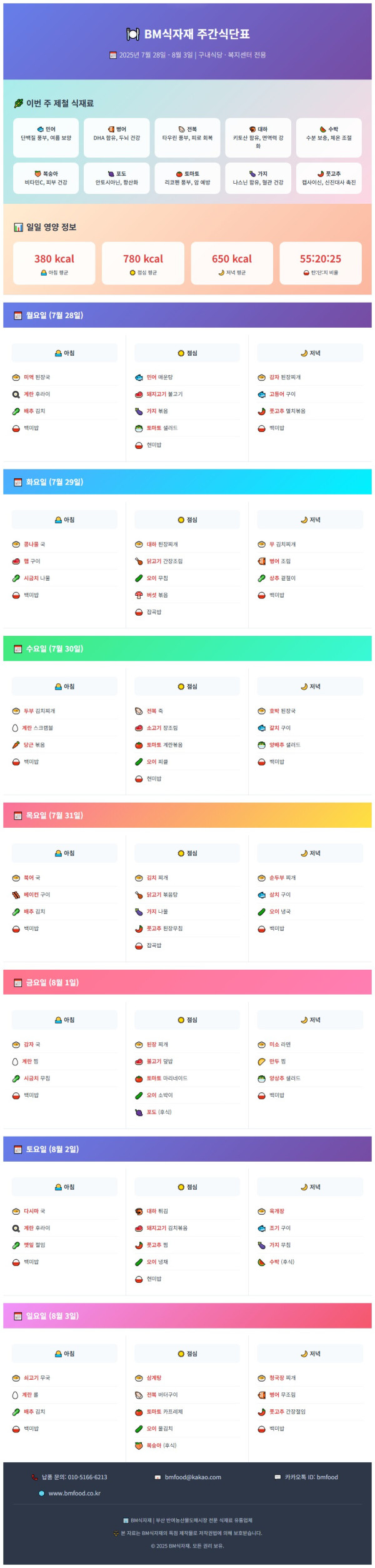 주간식단표 (2025.07.28-08.03) 페이지 정보 작성자 (BM)운영자 댓글 0건 조회 1,038회 작성일 25-07-26 05:53 본문 BM 주간식단표 (2025.07.28-08.03) 목록 이전글2025년 8월 1주 차 (8.4-8.10) 25.08.04 다음글2025년 7월 4주 차 (7.21-7.27) 25.07.24 댓글목록 댓글목록 등록된 댓글이 없습니다.