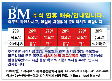 [BM 추석 휴무일안내] 페이지 정보 작성자 (BM)운영자 댓글 0건 조회 4,419회 작성일 15-11-04 08:23 본문 추석휴무일 : 9월 26일(토)~29일(화) / 4일간입니다.추석연휴 시작시점 25일 목요일과 연휴 끝시점 30일 수요일은 모든업체의 주문 폭주로 배송지연 및 재고부족등 제품 부족현상이 발생할수있으니 사전 물량 확보하고 준비하시길 부탁드립니다.감사합니다. 목록 이전글홈페이지 쇼핑몰연동 리뉴얼작업 재오픈 15.11.24 다음글여름 휴가(7월31~8월2일) 안내 15.11.04 댓글목록 댓글목록 등록된 댓글이 없습니다.