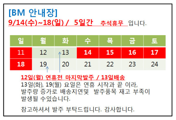 추석연휴 휴무안내 페이지 정보 작성자 (BM)운영자 댓글 0건 조회 3,979회 작성일 16-09-13 08:08 본문 추석연휴 휴무 09월14일(수)~18일(일) / 5일간입니다.행복한 한가위 보내세요.감사합니다. 목록 이전글쇼핑몰 곧 운영합니다.(통신판매업 신고완료) 16.10.17 다음글여름휴가(7월29~31일/3일간) 16.07.20 댓글목록 댓글목록 등록된 댓글이 없습니다.
