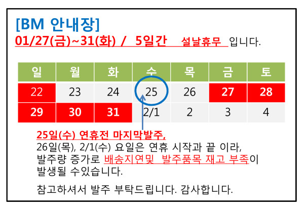 (설날) 휴무안내(27일(금)~31일(화)/5일간) 페이지 정보 작성자 (BM)운영자 댓글 0건 조회 6,512회 작성일 17-01-24 17:39 본문 (설날) 휴무안내(27일(금)~31일(화)/5일간)입니다. 새해복많이 받으세요.^^* 목록 이전글여름휴가 (8월4~6일/3일간) 입니다. 17.07.16 다음글쇼핑몰 곧 운영합니다.(통신판매업 신고완료) 16.10.17 댓글목록 댓글목록 등록된 댓글이 없습니다.