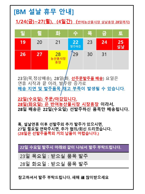 (설날) 휴무안내(24일(금)~27일(월)/4일간) 페이지 정보 작성자 (BM)운영자 댓글 0건 조회 4,703회 작성일 20-01-20 17:54 본문 (설날) 휴무안내(24일(금)~27일(월)/4일간) 목록 이전글[돈라국 안락점] OPEN.2022.09.21 22.09.22 다음글1월 1일(수)~2일(목) 2일간 휴무입니다. 19.12.30 댓글목록 댓글목록 등록된 댓글이 없습니다.