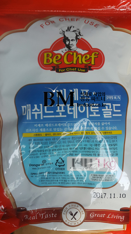 소스,양념 매쉬드포테이토 골드 페이지 정보 작성자 (BM)운영자 댓글 0건 조회 12,202회 작성일 15-12-22 19:24 목록 본문 비셰프 매쉬드포테이토 골드 (감자분말 86.7%)비셰프 매쉬드포테이토 골드는 신선한 통감자를 삶아서 건조시킨 제품으로 맛있는 감자요리를 편리하게 즐길 수 있습니다.사용용도 : 샐러드, 샌드위치, 스테이크의 사이드메뉴등의 감자요리에 활용내용량 : 1kgDongwon 삼조셀텍 이전글(크노르) 몬다민 루 화이트 16.01.21 다음글(면사랑) 냉동 납작면 #4 좁은면 15.12.22 댓글 0 댓글목록 등록된 댓글이 없습니다.
